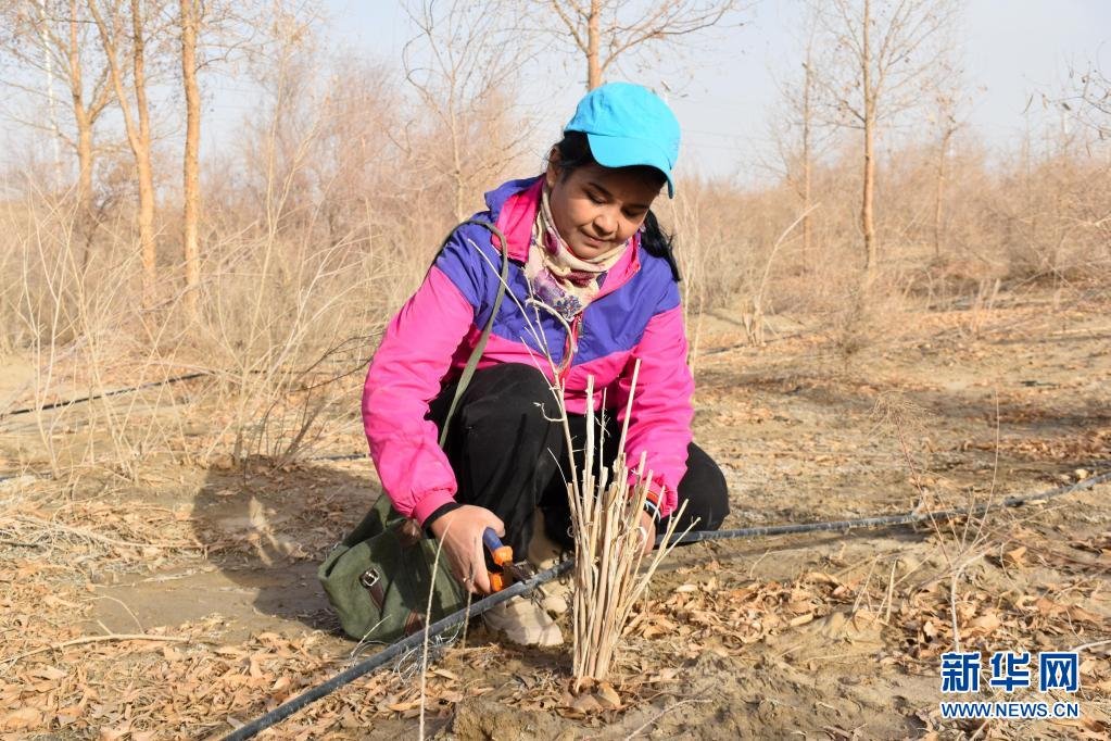 新疆且末縣河東治沙站員工帕提古麗·亞森在檢查梭梭林滴灌帶(4月1日攝)。新華社記者 高晗 攝