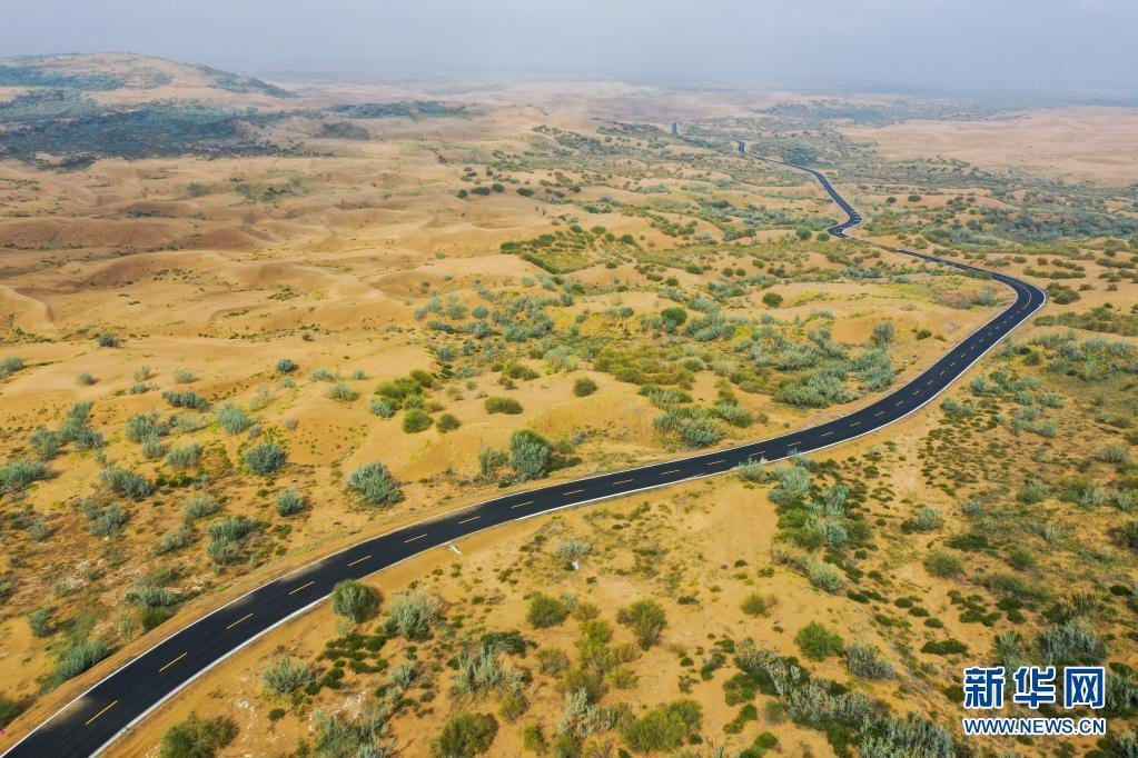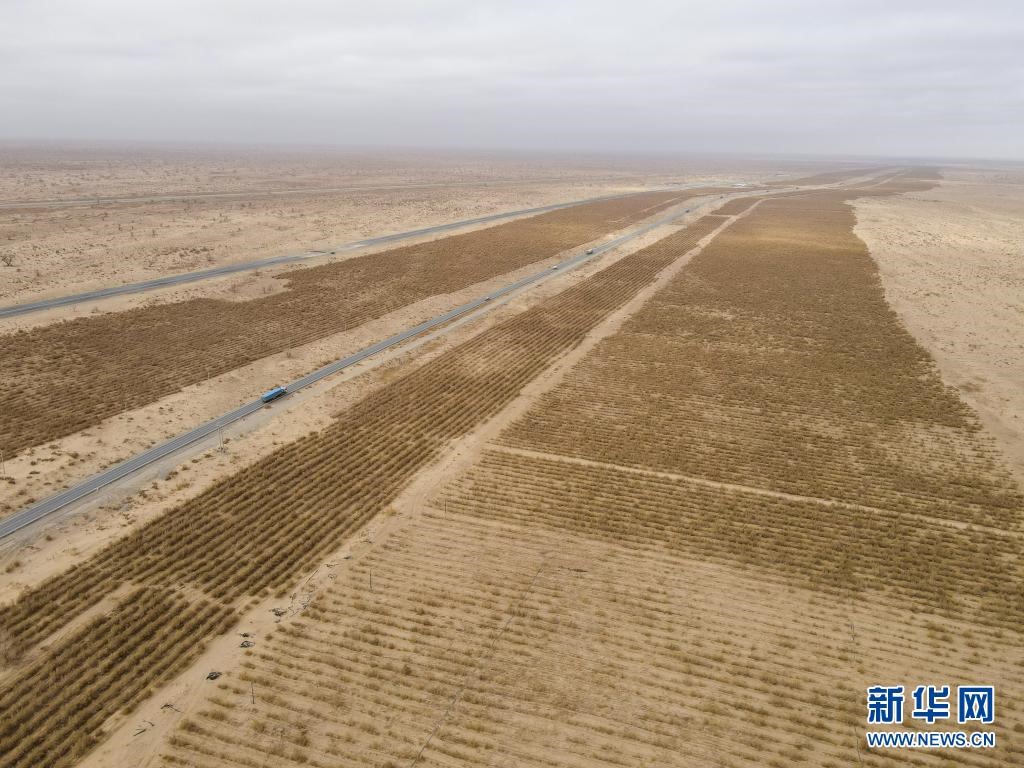 這是新疆且末縣國道旁種植的生態(tài)梭梭林(3月31日攝,無人機照片)。新華社記者 高晗 攝