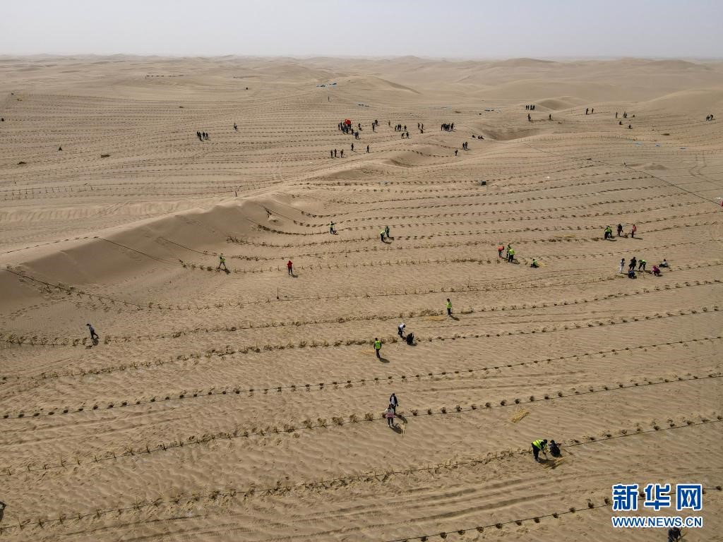 人們在距離新疆且末縣城不遠處的塔克拉瑪干沙漠內植樹(3月28日攝,無人機照片)。新華社記者 高晗 攝