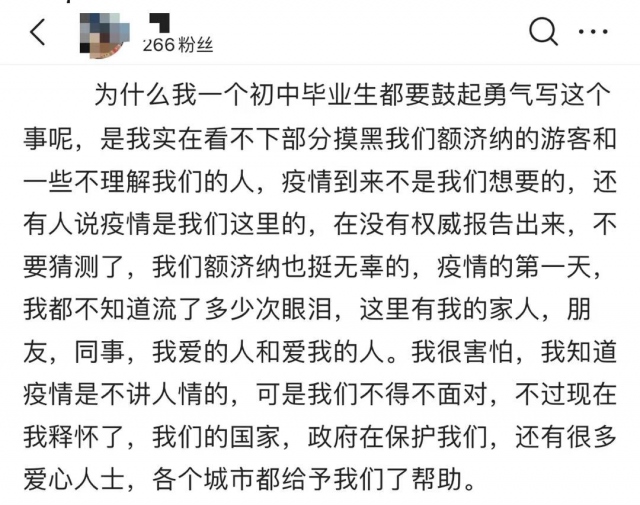 在社交媒體上,一名王姓女士通過(guò)短視頻呈現(xiàn)了一家人滯留額濟(jì)納的境況,在視頻中,她為同樣滯留在此的游客鼓勁:“如果你此時(shí)正在阿拉善,愿你如胡楊般堅(jiān)強(qiáng),積極應(yīng)對(duì)疫情?!边@條短視頻發(fā)出數(shù)小時(shí),就吸引了20余萬(wàn)瀏覽量。