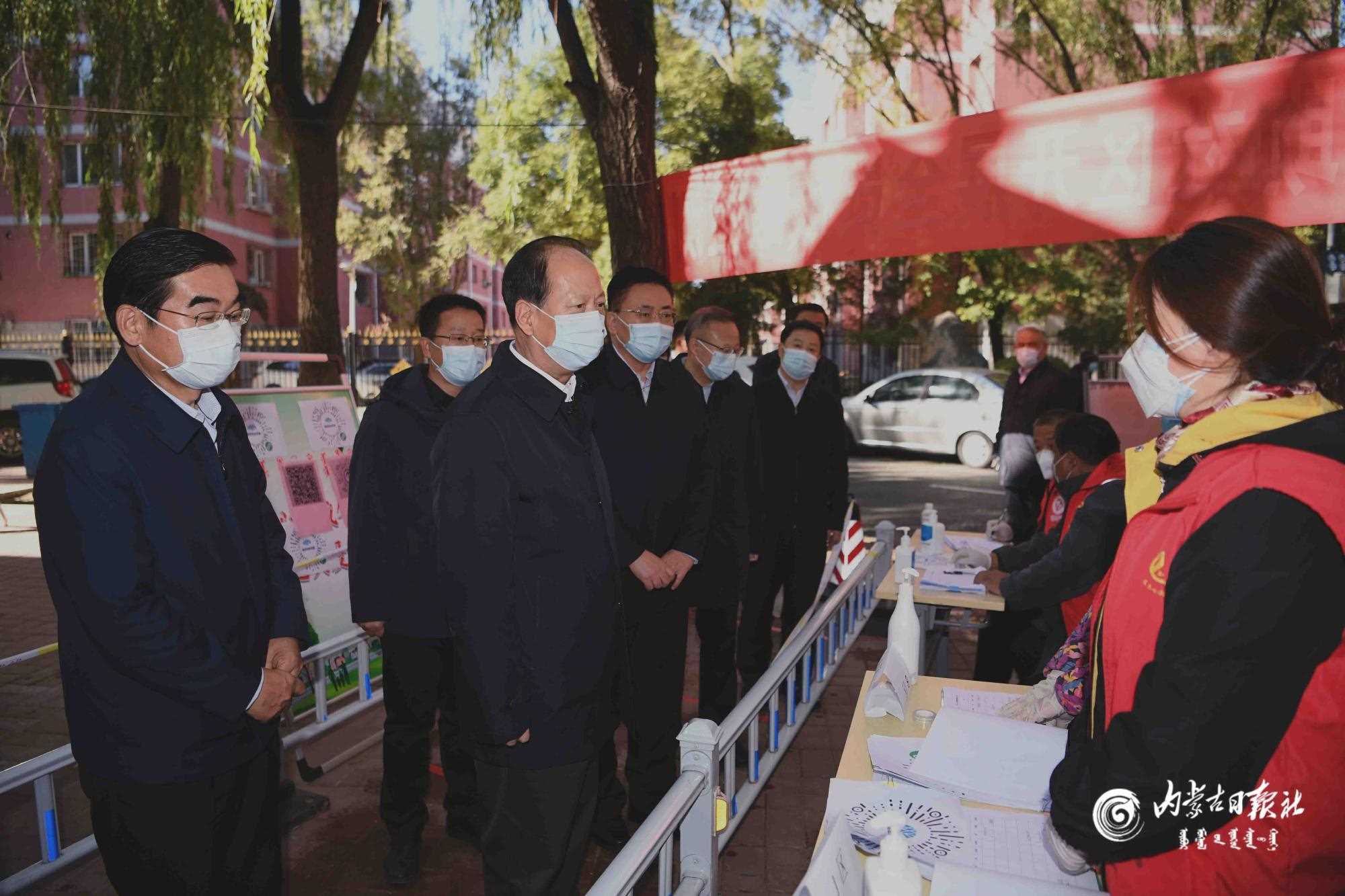 10月26日,自治區(qū)黨委書記、人大常委會(huì)主任石泰峰在學(xué)府花園小區(qū),檢查入口健康碼查驗(yàn)、體溫檢測、值班值守等情況,并來到核酸檢測采樣點(diǎn),仔細(xì)察看采樣登記流程。內(nèi)蒙古日報(bào)社融媒體記者 袁永紅 攝
