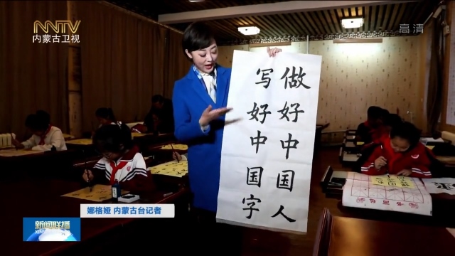 娜格婭 內蒙古臺記者:做好中國人,寫好中國字,你能想到我手中的這些字,是一個四年級小朋友寫的嗎?我現(xiàn)在是在呼和浩特鋼鐵路第二小學的興趣課上,學生們正在學習寫毛筆字,一筆一劃傳承書法文化,一撇一捺書寫著愛國情懷。像這樣的興趣課每周有一次。