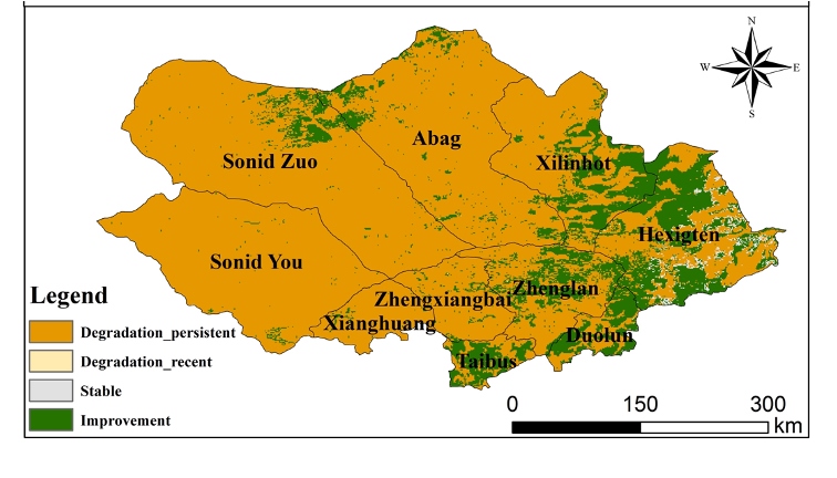 2000—2020年近21年渾善達克沙地生態(tài)質(zhì)量變化空間分異。圖源:中國林科院荒漠化研究所