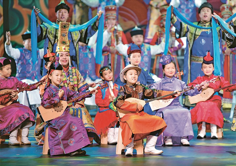 2022年9月4日,第八屆全國少數(shù)民族曲藝展演在內(nèi)蒙古自治區(qū)鄂爾多斯市開演。圖為演員在展演中表演蒙古族祝贊詞《禮贊新時代》。 人民圖片