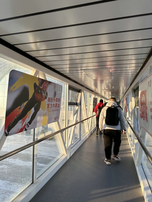 當記者一出機艙,一股寒流瞬間襲來,又瞬間被機場廊道、候機區(qū)、旅客出口區(qū)域滿滿的“十四冬”氛圍以及志愿者的迎接暖了心。