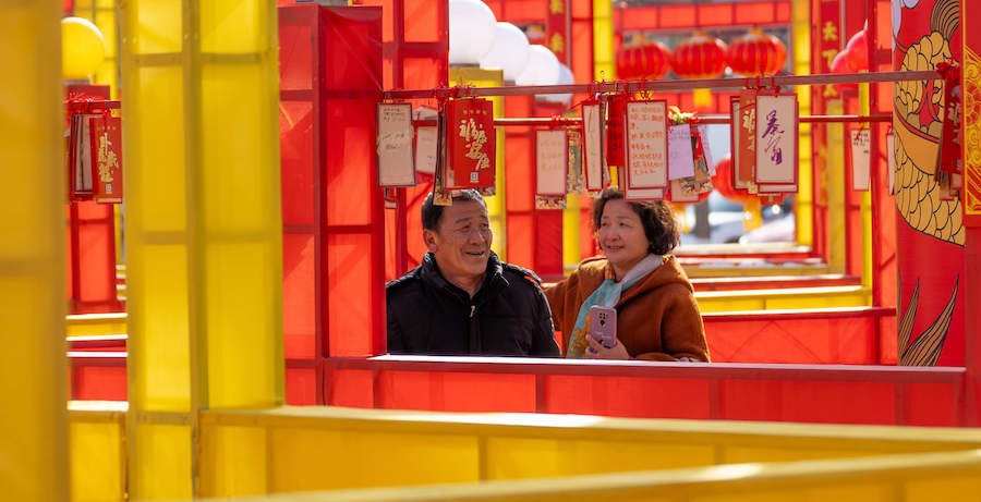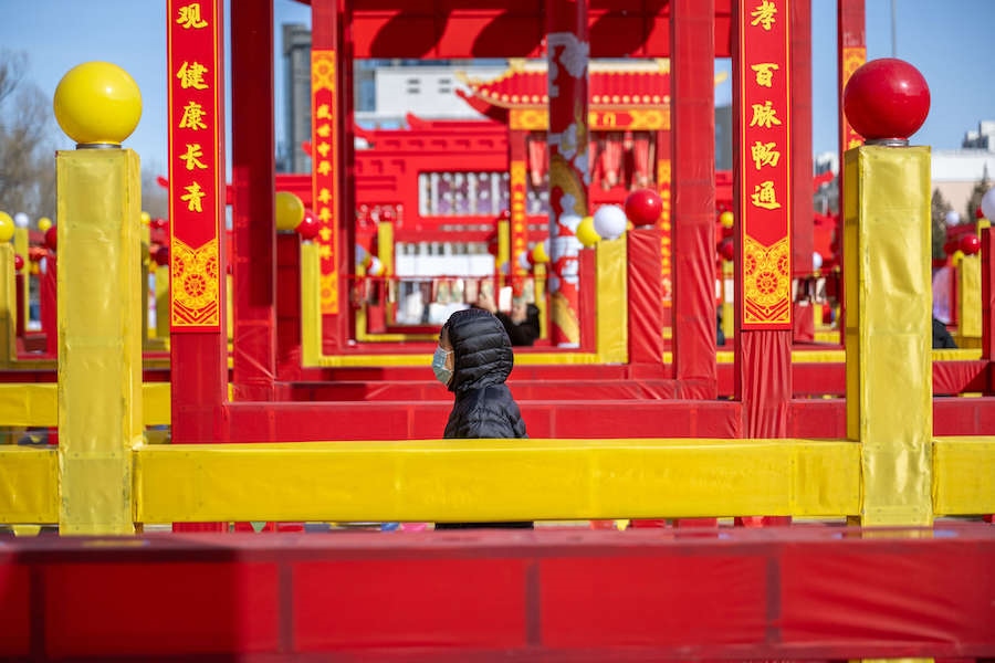在內(nèi)蒙古展覽館的九曲陣中設(shè)有八個(gè)關(guān)口,每個(gè)關(guān)口懸掛著印有感黨恩、北疆文化、冰雪旅游、中華詩(shī)詞、傳統(tǒng)年俗等有關(guān)的知識(shí)問(wèn)答彩旗。