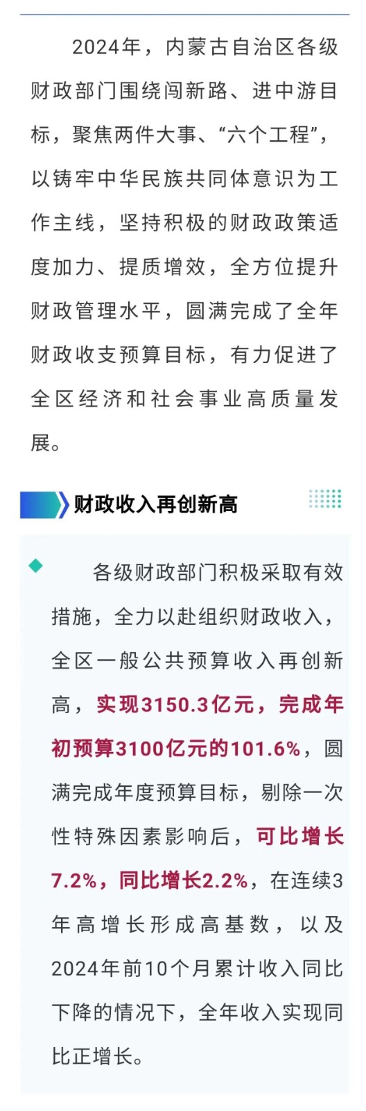 2025年,全區(qū)各級(jí)財(cái)政部門將以習(xí)近平新時(shí)代中國(guó)特色社會(huì)主義思想為指導(dǎo),全面貫徹黨的二十大和二十屆二中、三中全會(huì)精神,按照自治區(qū)黨委和政府的決策部署,堅(jiān)持以政領(lǐng)財(cái)、以財(cái)輔政,圍繞實(shí)施更加積極的財(cái)政政策,著力服務(wù)保障自治區(qū)大事要事,堅(jiān)定不移推動(dòng)貫穿“一條主線”、辦好兩件大事、完成“五大任務(wù)”、實(shí)施“六個(gè)工程”、開(kāi)展“六個(gè)行動(dòng)”落地落實(shí),為奮力書寫中國(guó)式現(xiàn)代化內(nèi)蒙古新篇章貢獻(xiàn)財(cái)政力量。