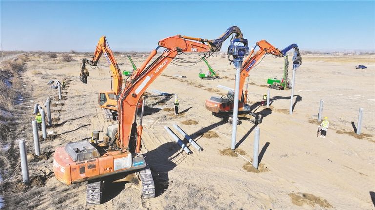 引孔機(jī)、打樁機(jī)轟鳴聲不絕于耳,打樁機(jī)將一根根水泥樁“釘”入地面中……連日來,巴彥淖爾市臨河區(qū)新華林場(chǎng)防沙治沙和光伏一體化項(xiàng)目施工現(xiàn)場(chǎng)多臺(tái)作業(yè)車輛同時(shí)進(jìn)行樁基作業(yè),現(xiàn)場(chǎng)還不時(shí)有工作人員對(duì)打樁等基礎(chǔ)工作進(jìn)行抽檢抽查,確保施工質(zhì)量。