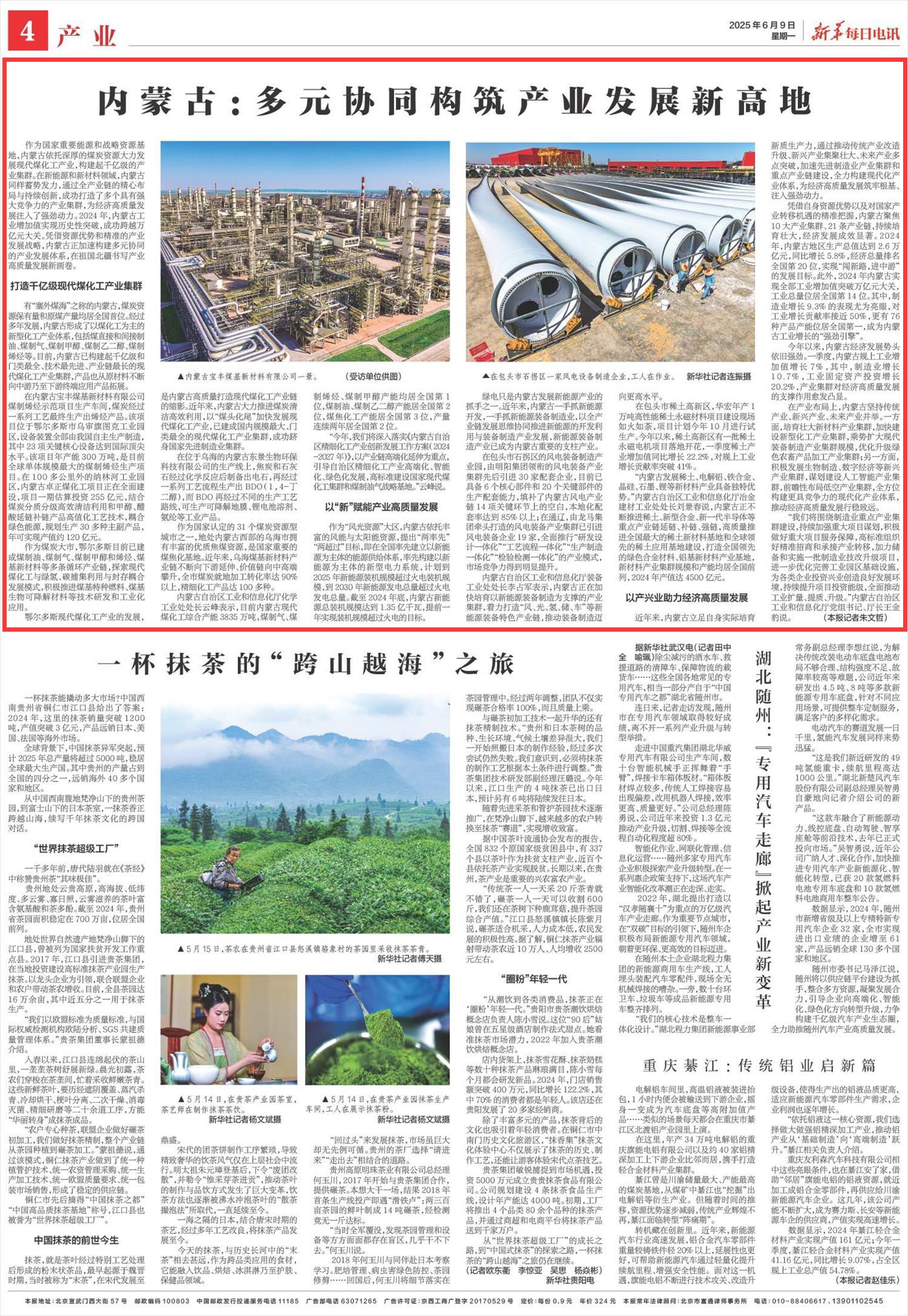 2025年6月9日《新華每日電訊》第4版刊發(fā)了《內(nèi)蒙古:多元協(xié)同構(gòu)筑產(chǎn)業(yè)發(fā)展新高地》的文章,報道了內(nèi)蒙古依托深厚的煤炭資源大力發(fā)展現(xiàn)代煤化工產(chǎn)業(yè),構(gòu)建起千億級的產(chǎn)業(yè)集群。憑借資源優(yōu)勢和精準的產(chǎn)業(yè)發(fā)展戰(zhàn)略,內(nèi)蒙古正加速構(gòu)建多元協(xié)同的產(chǎn)業(yè)發(fā)展體系,在祖國北疆書寫產(chǎn)業(yè)高質(zhì)量發(fā)展新畫卷。