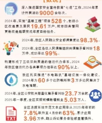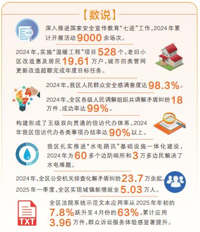 2024年,全區(qū)各級人民調(diào)解組織共調(diào)解矛盾糾紛18萬件、成功率達(dá)99%。全區(qū)信訪代辦各類事項辦結(jié)率達(dá)90%以上,一大批群眾急難愁盼事項得到及時就地解決。