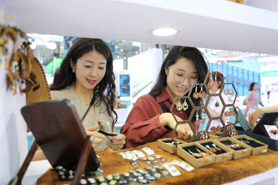 體驗(yàn)頭飾商品 北疆新聞記者 張楊攝影