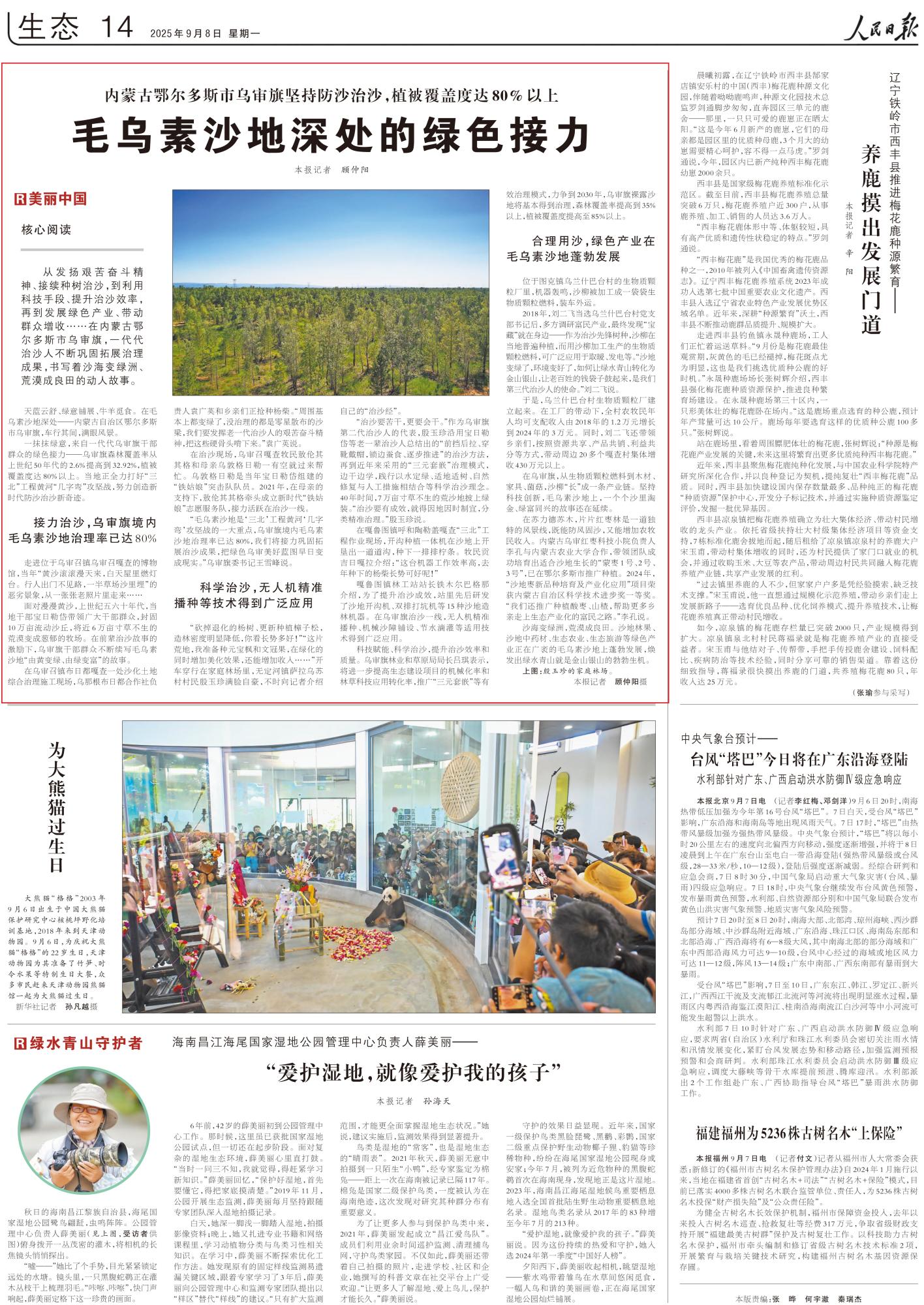 2025年9月8日《人民日報(bào)》第14版刊發(fā)了《內(nèi)蒙古鄂爾多斯市烏審旗堅(jiān)持防沙治沙,植被覆蓋度達(dá)80%以上 毛烏素沙地深處的綠色接力》的文章,報(bào)道了在內(nèi)蒙古鄂爾多斯市烏審旗,一代代治沙人不斷鞏固拓展治理成果,書寫著沙海變綠洲、荒漠成良田的動(dòng)人故事。沙地林果、沙地中藥材、生態(tài)農(nóng)業(yè)、生態(tài)旅游等綠色產(chǎn)業(yè)正在廣袤的毛烏素沙地上蓬勃發(fā)展,煥發(fā)出綠水青山就是金山銀山的勃勃生機(jī)。