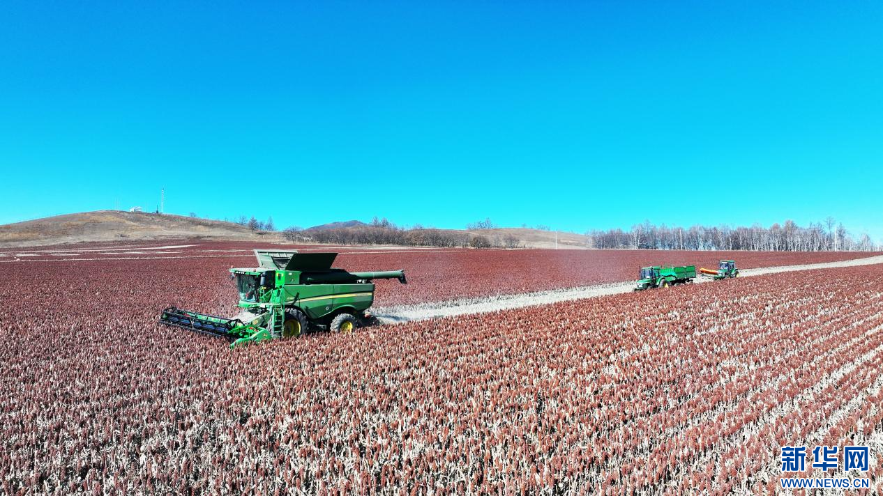 ??10月22日,在內(nèi)蒙古自治區(qū)呼倫貝爾農(nóng)墾綽爾河農(nóng)牧場有限公司田間,農(nóng)機手駕駛大型收割機收割高粱。新華網(wǎng)發(fā)(韓穎群 攝)