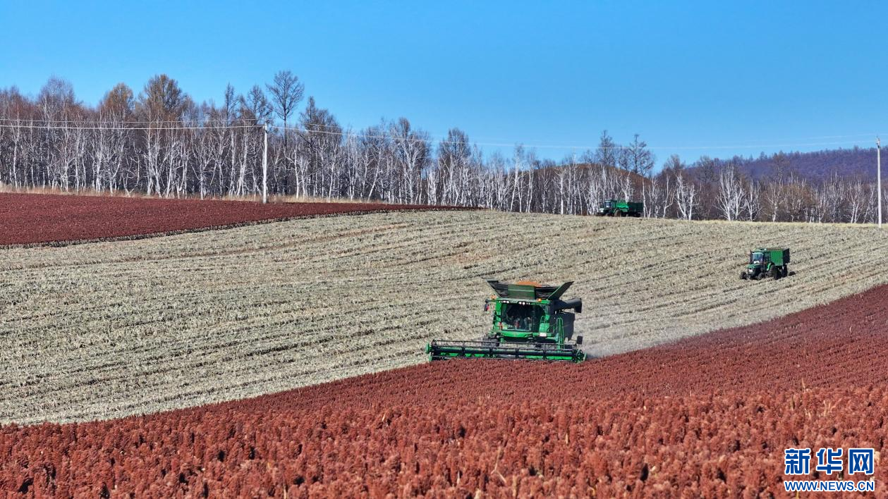 ??10月22日,在內(nèi)蒙古自治區(qū)呼倫貝爾農(nóng)墾綽爾河農(nóng)牧場有限公司田間,農(nóng)場員工正在收獲高粱。新華網(wǎng)發(fā)(哈園碩 攝)