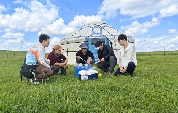 馬騰帶領(lǐng)團隊在內(nèi)蒙古錫林郭勒大草原采集自然發(fā)酵乳。左三為馬騰。受訪者供圖