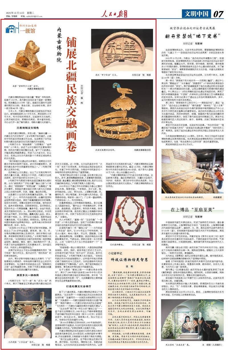 12月16日,《人民日報海外版》刊發(fā)《內(nèi)蒙古博物院 鋪展北疆民族交融畫卷》,報道內(nèi)蒙古自治區(qū)首個國家一級博物館今年6月搬遷至新館后開館試運行。新館建筑面積14.7萬平方米,展覽面積3.9萬平方米,均為舊館的兩倍多。這座城市文化地標(biāo),以更開闊的空間、更精彩的展覽、更豐富的體驗,為公眾打開一扇了解內(nèi)蒙古、領(lǐng)略北疆文化的窗口。