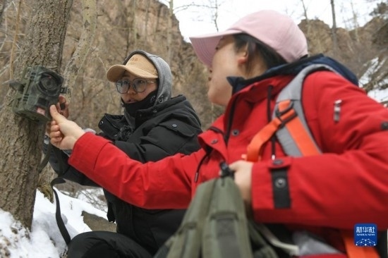 2月20日,在內(nèi)蒙古賀蘭山國(guó)家級(jí)自然保護(hù)區(qū),工作人員阿麗瑪(左)和徐皓在布設(shè)紅外相機(jī)。
