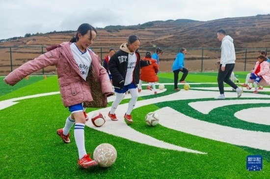 圖為在“玫瑰夢(mèng)想球場(chǎng)”上,瓦吾小學(xué)的女足隊(duì)員們?cè)诮叹毑車(chē)?guó)棟(前)的帶領(lǐng)下訓(xùn)練(2023年3月3日攝)。