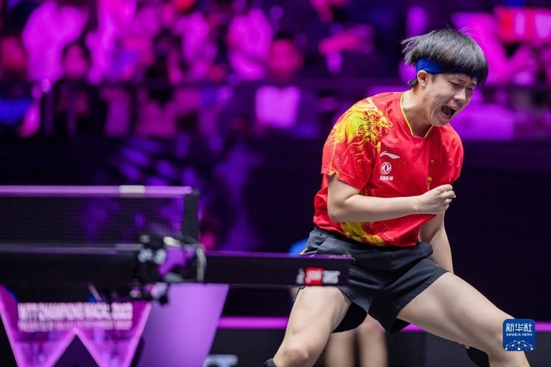2023年4月23日,王曼昱在比賽中慶祝得分。當(dāng)日,在澳門塔石體育館舉行的2023世界乒乓球職業(yè)大聯(lián)盟(WTT)澳門冠軍賽女子單打決賽中,中國選手王曼昱以4比2戰(zhàn)勝隊友陳夢,奪得冠軍。新華社記者 張金加攝