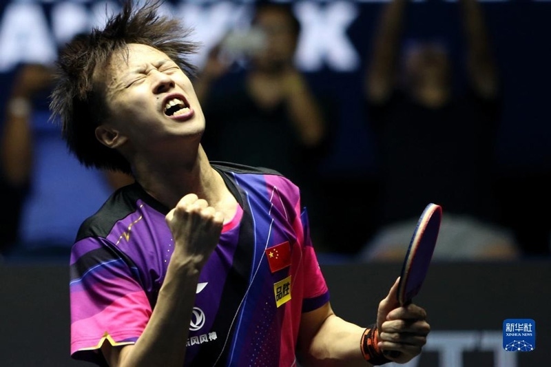 2023年4月23日,中國選手王楚欽慶祝得分。當(dāng)日,在澳門塔石體育館舉行的2023世界乒乓球職業(yè)大聯(lián)盟(WTT)澳門冠軍賽男子單打決賽中,中國選手王楚欽以4比0戰(zhàn)勝隊友馬龍,奪得冠軍。新華社記者 張金加攝