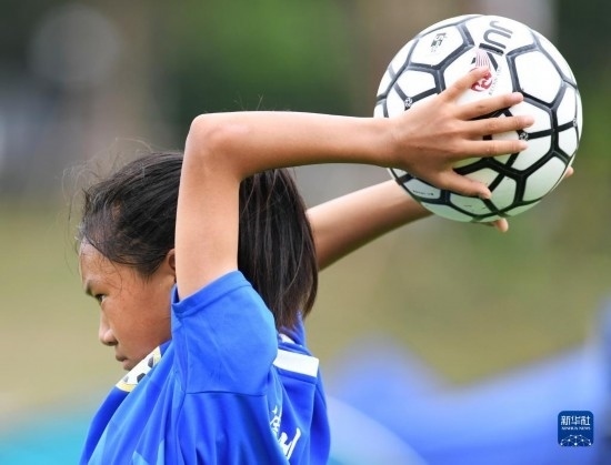 在海南瓊中縣舉辦的中國足協(xié)女足青訓(xùn)中心“希望杯”U12組四川隊對陣廣東隊的比賽中,來自涼山彝族自治州的四川隊球員舍布么扯鳩莫發(fā)邊線球(4月10日攝)。