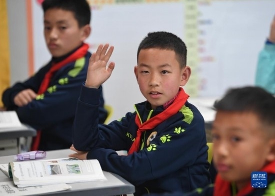 在瀘州天立春雨學(xué)校教室,來自涼山彝族自治州的金貴坤(中)在課堂上舉手回答老師提問(3月28日攝)。