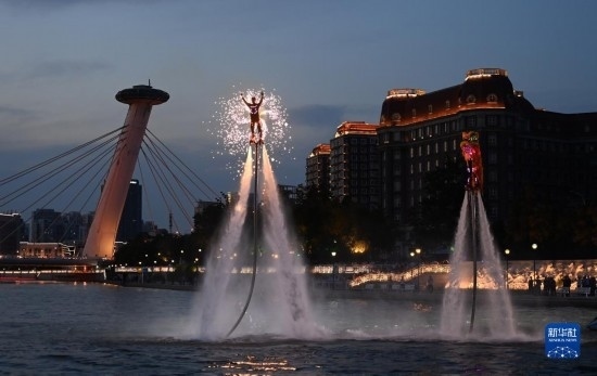 6月22日,一場(chǎng)水上特技表演在天津海河赤峰橋附近舉行。