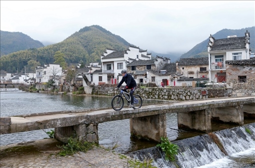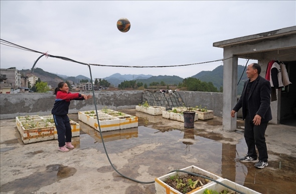 3月27日,李文文在屋頂露臺和父親玩投籃游戲。李文文是貴州臺江縣臺盤鄉(xiāng)中心小學的女籃隊長,以前他的父親在外地務(wù)工,如今火爆全網(wǎng)的“美麗鄉(xiāng)村”籃球聯(lián)賽給臺盤鄉(xiāng)帶來了人氣,父親在家門口就能找到工作。