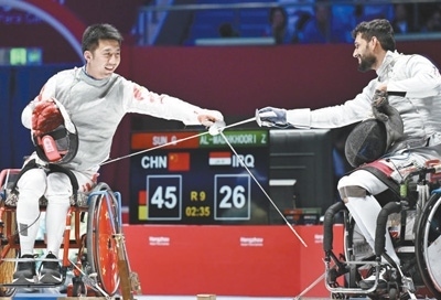 杭州亞殘運(yùn)會(huì)輪椅擊劍男子花劍團(tuán)體金牌賽,中國(guó)體育代表團(tuán)運(yùn)動(dòng)員孫剛(左)與伊拉克體育代表團(tuán)運(yùn)動(dòng)員友好示意。本報(bào)記者 王 亮攝