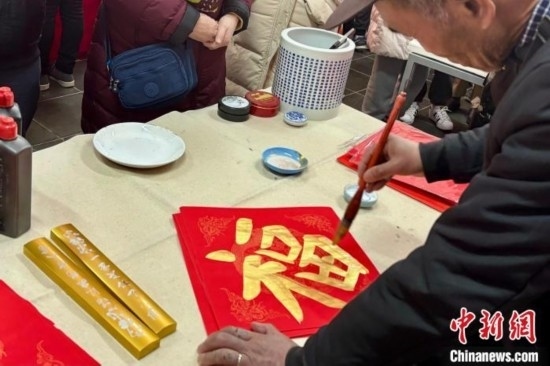 2月10日,大年初一,北京廠甸廟會(huì)開(kāi)門(mén)迎客。圖為書(shū)法家為市民和游客寫(xiě)福、送福。中新社記者 徐婧 攝