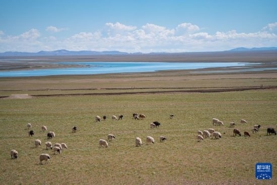 6月22日,羊群在色林錯(cuò)湖畔草場上吃草。