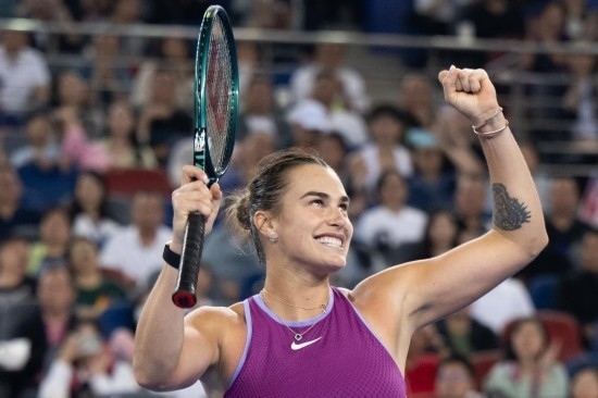 10月13日,薩巴倫卡在獲勝后慶祝。當日,在武漢網球公開賽女單決賽中,薩巴倫卡戰(zhàn)勝鄭欽文,奪得冠軍。新華社記者 肖藝九 攝