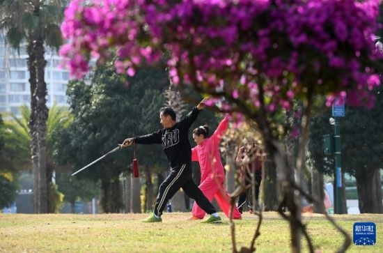 2月4日,人們在廣西南寧市南湖邊健身。