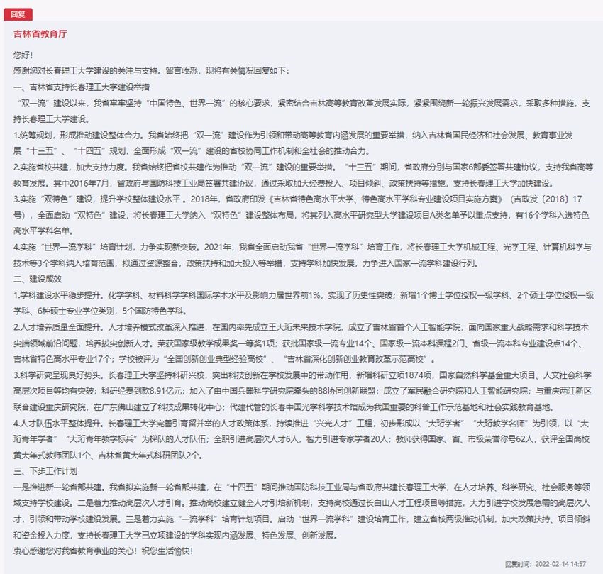 吉林省教育廳回復(fù)了網(wǎng)友的留言,并對吉林省高校建設(shè)工作進行了詳細闡述。