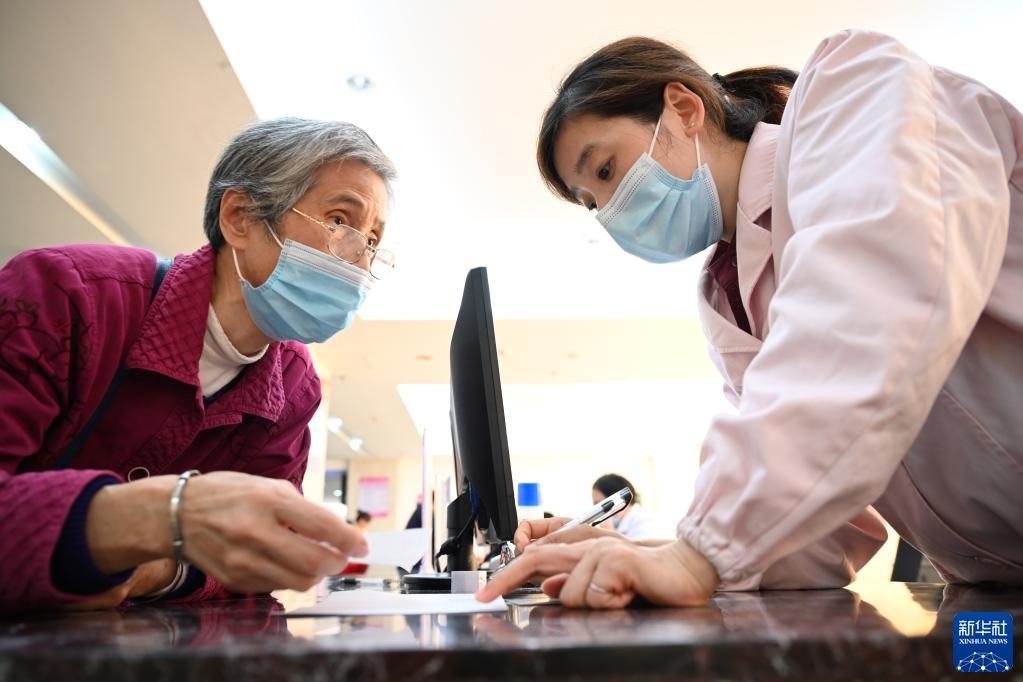 福建省三明市第一醫(yī)院醫(yī)保辦工作人員(右)向前來咨詢藥品報銷問題的居民講解相關政策(2020年11月18日攝)。新華社記者 姜克紅 攝