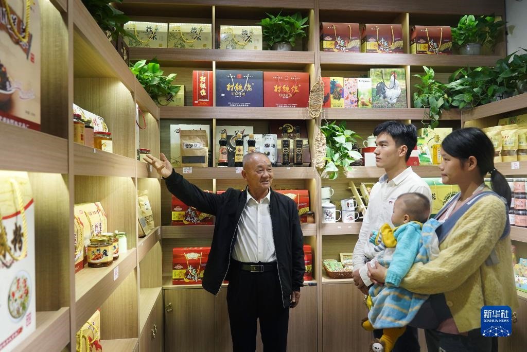 2020年10月21日,江西省贛州市于都縣梓山鎮(zhèn)潭頭村村民孫觀發(fā)(左一)向游客介紹當地的特色農產品。 新華社記者 萬象 攝