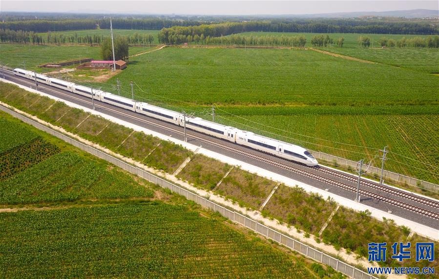 一列“和諧號”動車組列車行駛在內(nèi)蒙古赤峰市元寶山區(qū)的田野間(6月30日攝,無人機(jī)照片)。 當(dāng)日,隨著G8382次“和諧號”動車組列車從內(nèi)蒙古赤峰站緩緩駛出,喀左至赤峰高鐵全線開通運營。該線經(jīng)喀左站與京沈高鐵接軌,內(nèi)蒙古赤峰地區(qū)由此接入全國高鐵網(wǎng)。 新華社記者 彭源 攝 -