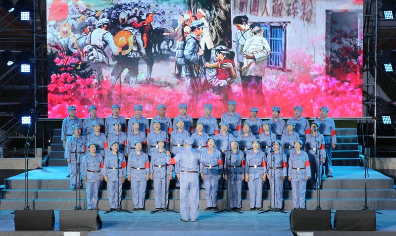 “唱支山歌給黨聽,我把黨來比母親,母親只生了我的身,黨的光輝照我心......”雨后的舞臺煥然一新,一首首耳熟能詳?shù)母锩枨?,把人們的思緒瞬間拉回歷史的長河,手中揮舞著一面面鮮艷的五星紅旗,點(diǎn)亮了整個夜晚。